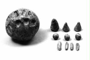 b. ricostruzione di gettoni sumeri per la rappresentazione di