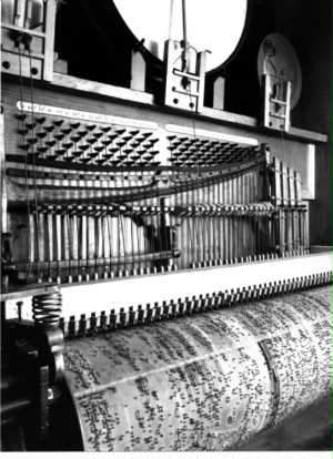Fig. 53. Particolare di un telaio Jacquard. Un contributo indiretto, ma importante, nell'evoluzione dei calcolatori si deve a J. Jacquard (1752-1834), che nel 1804 presentò all'esposizione universale di Parigi un sistema a schede perforate in grado di automatizzare le lavorazioni dei telai nello stabilimento di tessitura di seta del padre. Le schede perforate influenzeranno in seguito lo sviluppo dell'elaborazione automatica. Infatti, la scheda perforata di Jacquard suggerì a Babbage e più tardi ad altri inventori il meccanismo per immettere i dati e i programmi di calcolo nelle loro macchine. |