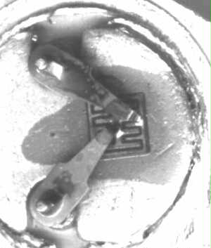 contatto) con la piastrina di silicio visibile. Inizialmente il transistor venne