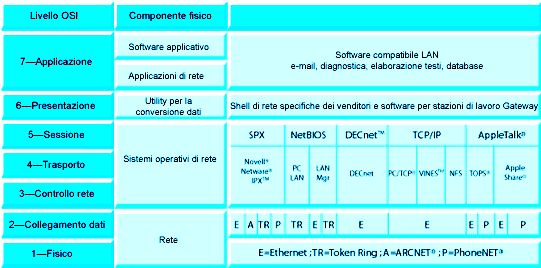 La figura che segue riporta lo schema del modello OSI e la disposizione, all'interno del modello stesso, di alcuni tra i più noti protocolli.